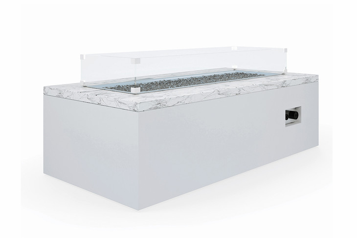 Extend your outdoor entertaining well into the evening with Jack Patio contemporary fire tables. A natural White Carrara Marble top sits atop a frost white aluminum cabinet on our Carrara Fire Tables.